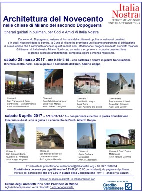 Il primo itinerario, sabato 25 marzo 2017, comincerà in centro città con la chiesa di San Francesco di Sales (Arch. Gandolfi), per poi proseguire verso nord, in viale Monza, con le chiese di San Gabriele Arcangelo (Fratelli Castiglioni) e di San Basilio Magno (Arch. Dal Corno) fino a Sesto San Giovanni per terminare con la chiesa della Resurrezione di Gesù, dell’Architetto Cino Zucchi.