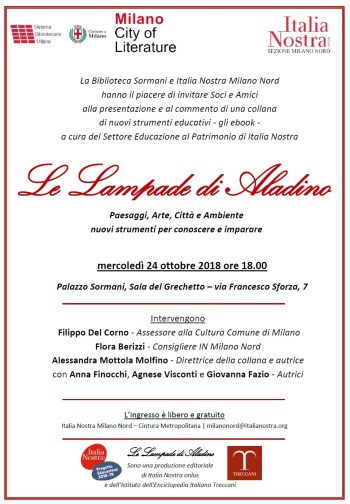 La nostra Sezione ha l’onore di presentare al pubblico milanese una bellissima quanto importante iniziativa realizzata dal Settore Educazione di Italia Nostra nazionale (Le Lampade di Aladino) sotto la direzione di Alessandra Mottola Molfino ben nota ai milanesi per essere stata l’infaticabile e creativa direttrice del Museo Poldi Pezzoli e quindi per anni